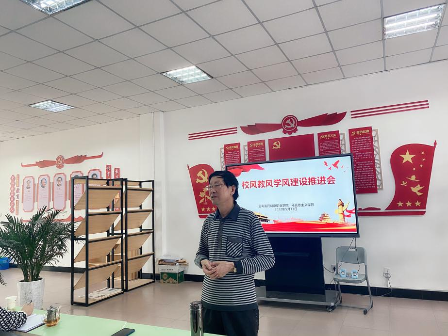为了进一步加强学生管理、教学管理,优化人育环境,规范教学行为,提高教学质量,营造积极和谐的校园氛围,云南医药健康职业学院根据省委教育工委和省教育厅的通知要求,计划用3个多月时间,在全校范围内开展“三风”建设及专项整顿工作,召开了专门会议进行安排部署,印发了开展校风教风学风建设及专项整顿工作实施方案,并详细列出工作责任分工表。马克思主义学院院长胡椿教授及时传达了学校的工作安排及文件精神。为了更好地贯彻落实学校工作部署,扎实推进“三风”建设相关工作,马克思主义学院于2022年5月13日下午在昆明校区校区图书馆二楼党建学习室召开本部门校风教风学风建设推进会,进一步明确此项工作的目的意义,对标对表部署马克思主义学院的相关工作。       胡椿院长根据省委教育工委、省教育厅的相关通知要求和学校印发的文件精神,阐明了开展此项工作的目的意义和必要性,详细解读了有关会议和文件精神。他指出,在学校印发的工作责任分工表中,一级指标有6大板块、二级指标有37项,三级指标有204条,其中马克思主义学院的直接任务有18条,间接任务有19条,我们学院以及每一位教师要对标对表积极主动落实和推进三风建设。他结合马克思主义学院的实际,分别从学院和下属两委(教学委、学术委)两组(宣传信息工作组、实践教学工作组)各教研室以及思政课教师个人三个层面提出了贯彻落实意见。他指出,“三风”是学校精神状态的体现,事关立德树人根本任务的落实,事关各方面的工作,事关人人,要充分认识其重要意义,强化重在建设、人人担责。思政课教师要结合思政课教学融入相关工作;马院有26位教师还担任了学业导师(班主任)、有多位教师承担指导学生社团工作、有的老师参与了学校的党课和讲座等工作,这些工作都有助于直接推动促进“三风”建设;马院教师承担的一些科研课题也有助于“三风”建设;思政课教师在抓好思政课程的同时,还要积极支持课程思政工作,助推“三风”建设;思政课教师自己要在教学科研工作中以身作则、以身垂范,做“三风”建设的表率。我们还要加强工作作风和党风建设,我们学院教师的党员占比最高,加强党风建设具有重要意义作用,要充分发挥好共产党员的先锋模范作用,以党风带动工作作风和校风、教风、学风建设。