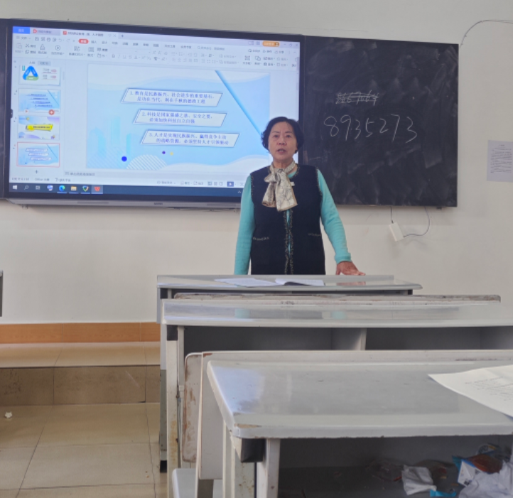 学校党委副书记曾永群首先从建设教育强国、科技强国、人才强国的重大意义出发,结合课程内容相关的图片、视频资料、案例,深入浅出的讲述了“教育”是学生成长成才、适应社会发展变化的关键所在;“科技”是人类发展变化的助推器,改变人们学习、生产、生活方式;“人才”是推动社会向前发展的重要资源。并告诫学生要珍惜在校时光,努力学习科学文化知识,理论联系实际,努力成长,争取为社会的发展贡献自己的一份力量。