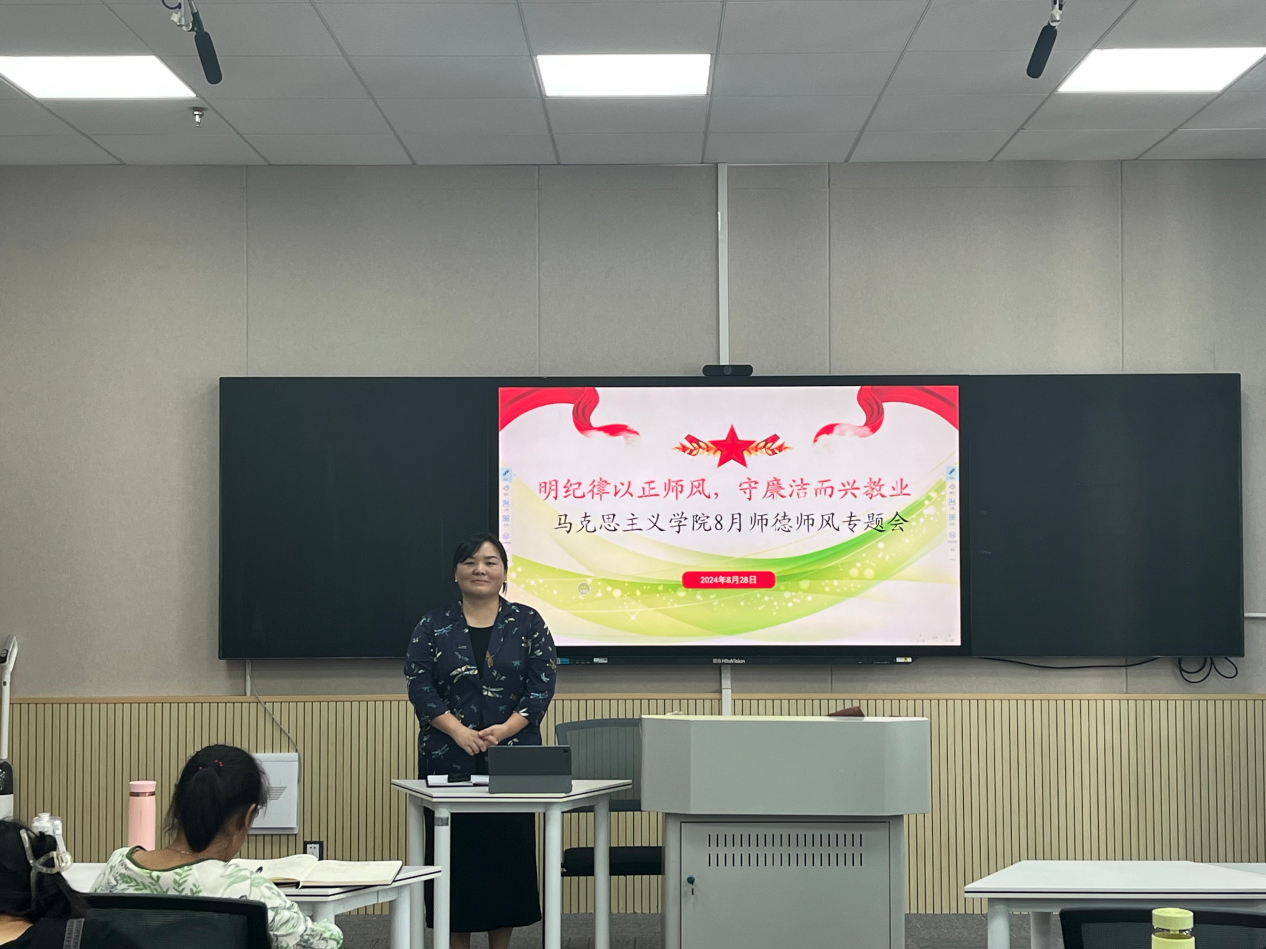 最后,字慧院长围绕师德师风建设进行了专题教育。她结合思政课教师“六个要”标准、“高校教师十项行为准则”和“教育家精神”等相关内容,对思政课教师提出“三认清一做好”、坚决杜绝师德失范行为发生的要求,呼吁全体教职工要“认清现实、认清职业、认清自己,做好云医药的思政课教师”,不但要站上讲台,还要站对讲台,更要站稳讲台;要树立正确的世界观、人生观、价值观,以高度的责任感和使命感投身于教书育人的伟大事业中去。字慧院长还特别强调,每一位教师都应当成为学生健康成长的引路人,用自己的言行举止影响和带动学生,努力培养出德智体美劳全面发展的社会主义建设者和接班人。