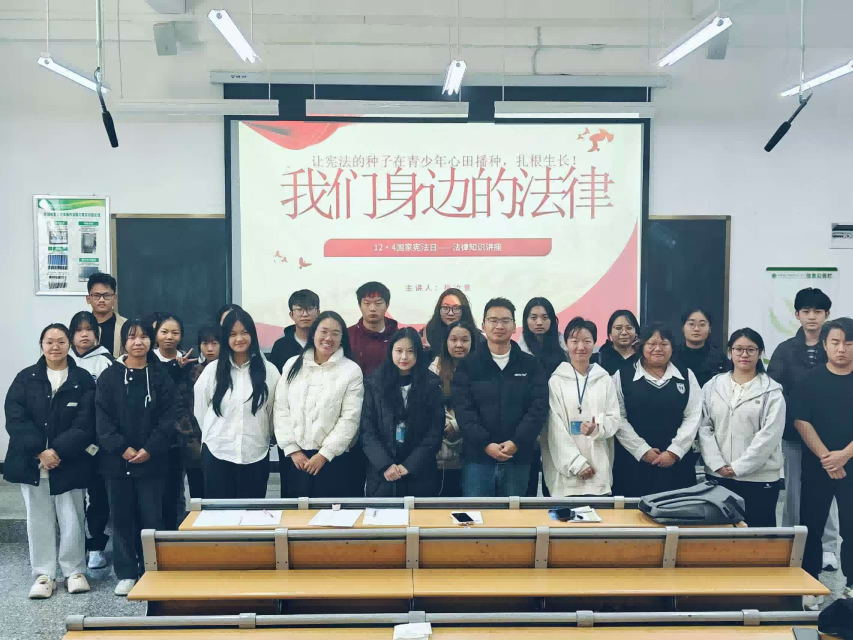 在第十一个国家宪法日来临之际,为大力弘扬宪法精神,推动进一步全面深化改革,深化普法强基,建设法治校园,不断增强大学生的法治意识,2024年12月3日,云南医药健康职业学院学生模拟政协协会在安宁校区五教108教室开展宪法知识讲座活动——“我们身边的法律”。本次活动邀请了马克思主义学院杨汝意老师为学生模拟政协协会全体同学开展普法活动。杨老师结合学生的生活实际,从七个方面讲述了大学生在学习生活中可能发生的违法违规行为,引发了学生的思考。