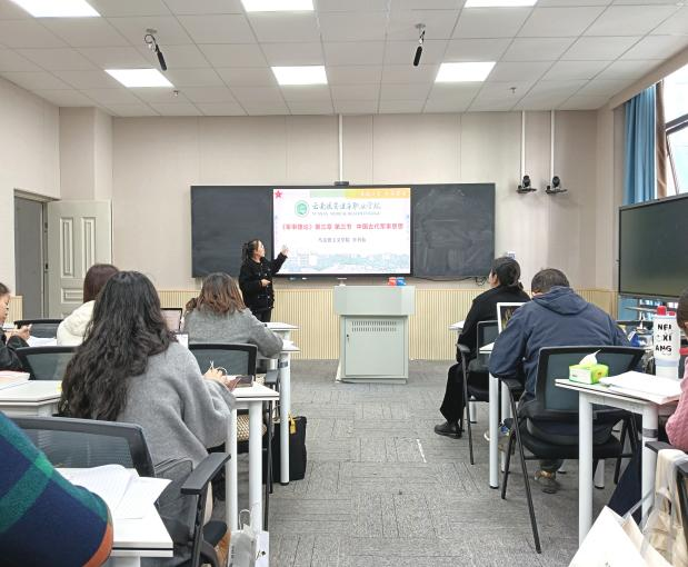 在分课程组聚焦环节,四位教师按课程依次展示教学设计,精研教学细节。《习近平新时代中国特色社会主义思想概论》课程的赵建云老师以第十章“建设社会主义文化强国”为磨课内容,从章节重难点解析、学情分析、问题清单梳理、政策融入路径四个维度切入,以“社会主义核心价值观引领文化建设”为教学范例,通过“是什么、为什么、怎么做”的逻辑框架,清晰呈现教学思路,重点阐释了二十届四中全会精神与教学内容的有机融合点。《思想道德与法治》课程的叶俊梅老师围绕第四章“明确价值要求  践行价值准则”,从说教材、说教学目标、说重点难点、说教法学法、说教学过程五个方面系统展示教学设计,结合云南本地案例搭建理论与实践的桥梁,以“社会主义核心价值观落细落小落实”为切入点,完整呈现了从理论逻辑到实践逻辑的教学转化过程。《军事理论》课程的李利仙老师聚焦“中国古代军事思想”章节,结合时事政治与经典案例,详细拆解《孙子兵法》教学内容的讲解思路,从课程设置、学情分析、教学过程三个层面展现了传统军事文化与现代思政教育的结合路径。《形势与政策》课程的姚娅老师以“阔步迈向农业强国”为主题,立足夯实基础、锚定目标、问题导向、立足国情四个方面,引导学生深刻认识农业农村现代化的重大意义,准确把握相关战略部署,将中央一号文件精神与“三农”问题教学紧密结合。